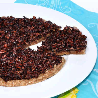 Form a circle with the dough (20 cm diameter). Cover it with the chocolate chip topping. Put your cookie in the dehydrator until it gets solid. To keep its consistency put the  cookie in the refrigerator after dehydrating.